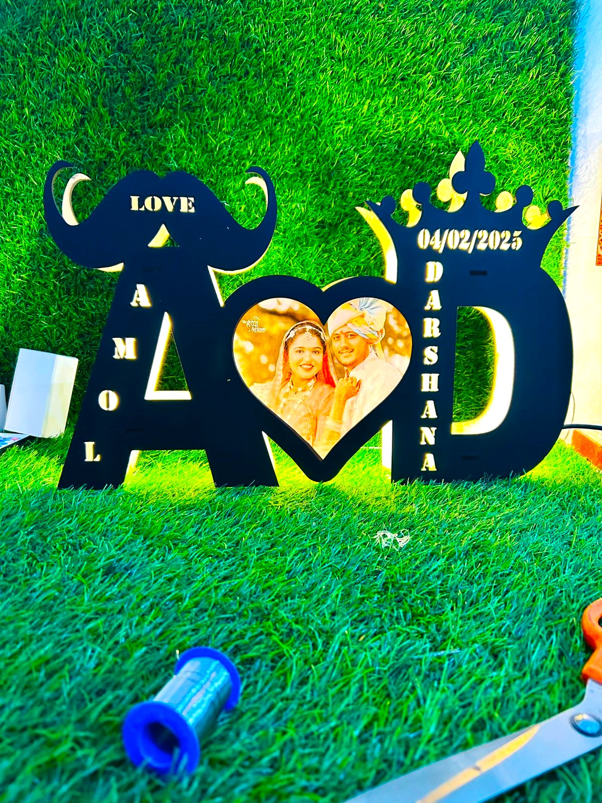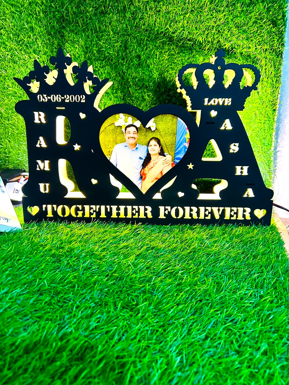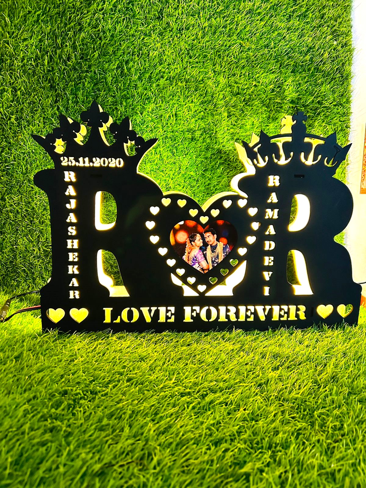 LED Wooden Name with 2 letters, occasion, and Photo crafted by MDF wooden board assembled with 2 layers of high-quality wooden board and warm white led light. This is designed by our designer, especially for you. Occasion and 2 names will get cut out on both letters. You have to choose 2 letters on the order page and give your 2 names to be cut out on the letters. Phot should be clear to be pasted on the center of both the letters
