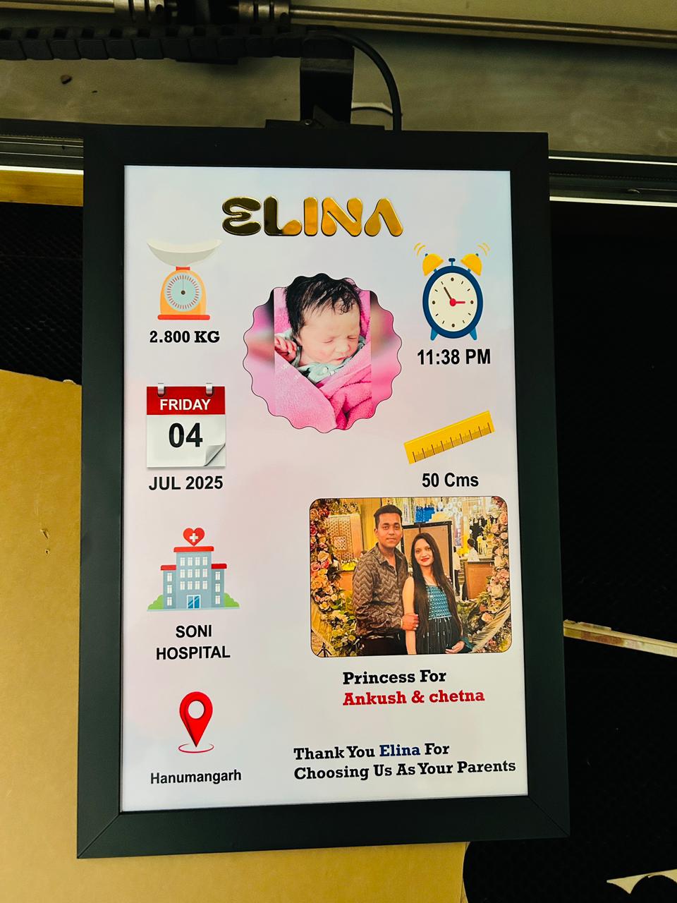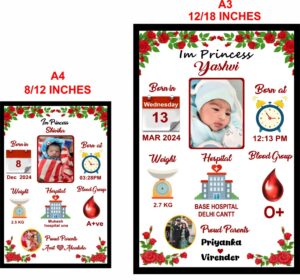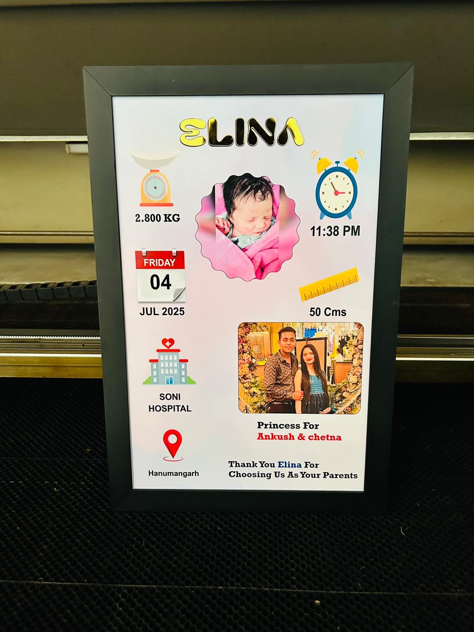 Personalized Baby Birth Details Frame | Custom Newborn Photo Frame Celebrate the arrival of your little one with this fully customized Baby Birth Details Frame. Add your baby’s name, date & time of birth, weight, height, hospital, city, and even a sweet photo to create a lifelong memory. Perfect for baby room décor or as a thoughtful gift for new parents.